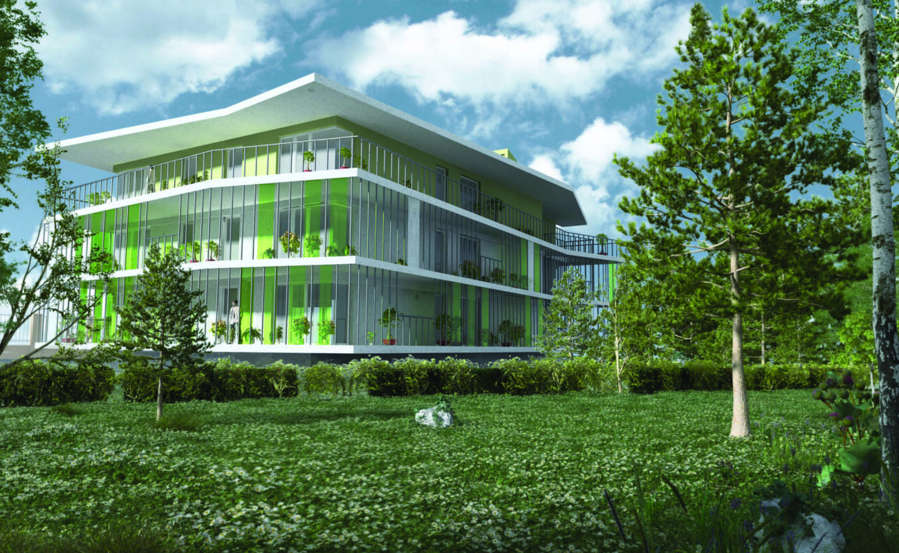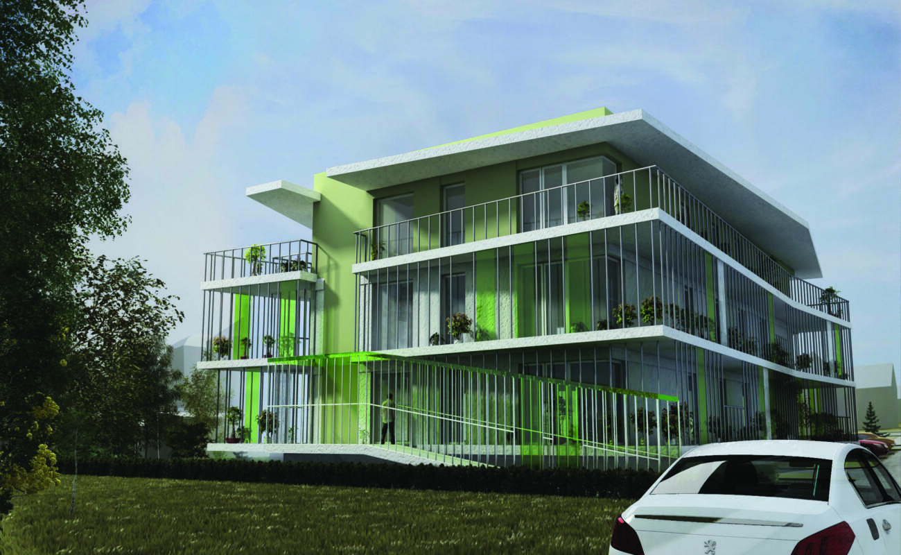VILADŮM V PRAZE 6 – SUCHDOLE, DLOUHO, DLOUHO K CÍLY. Anotace projektu, začatého v r. 2010 a dodnes, jak je v Praze dnes bohužel běžné, projektu na který jsme zatím ani nemohli podat žádost o ÚR, protože čekáme na změnu/úpravu Pražského Územního plánu. Dům je na pozemku ležícím původně pro zástavbu RD a proto je nutno nejdříve změnit ÚP a pak teprve stavět. Zajímavé je, že stavba Palestinské ambasády, větší než je naše stavba, je už kolaudovaná a funguje, i když pražský ÚP zatím v těchto místech změněn nebyl. Co k tomu dodat. Nic. Tvar i velikost domu se měnily tak, jak se měnil tvar pozemku stavebníka Stavebního podnikání s.r.o. i jeho podnikatelský záměr. Inspirovali jsme se současnou výstavbou energeticky úsporných bytových domů s výraznou aplikací balkonových teras po celém obvodu stavby, ať to byl bytový dům v Brigittennau ve Vídni, nebo s týmž balkonovým principem v Paříži. Každý byt tak má balkonovou předzahrádku plnou zeleně a ta vytváří přirozený klimatický obal stavby. Urbanistická problematika místa stavby je složitá a není to jen věčná diskuse, zda-li Pražský městský okruh Suchdolem povede, ano, či ne. Nicméně věříme, že se ÚP změní a my náš viladům postavíme.